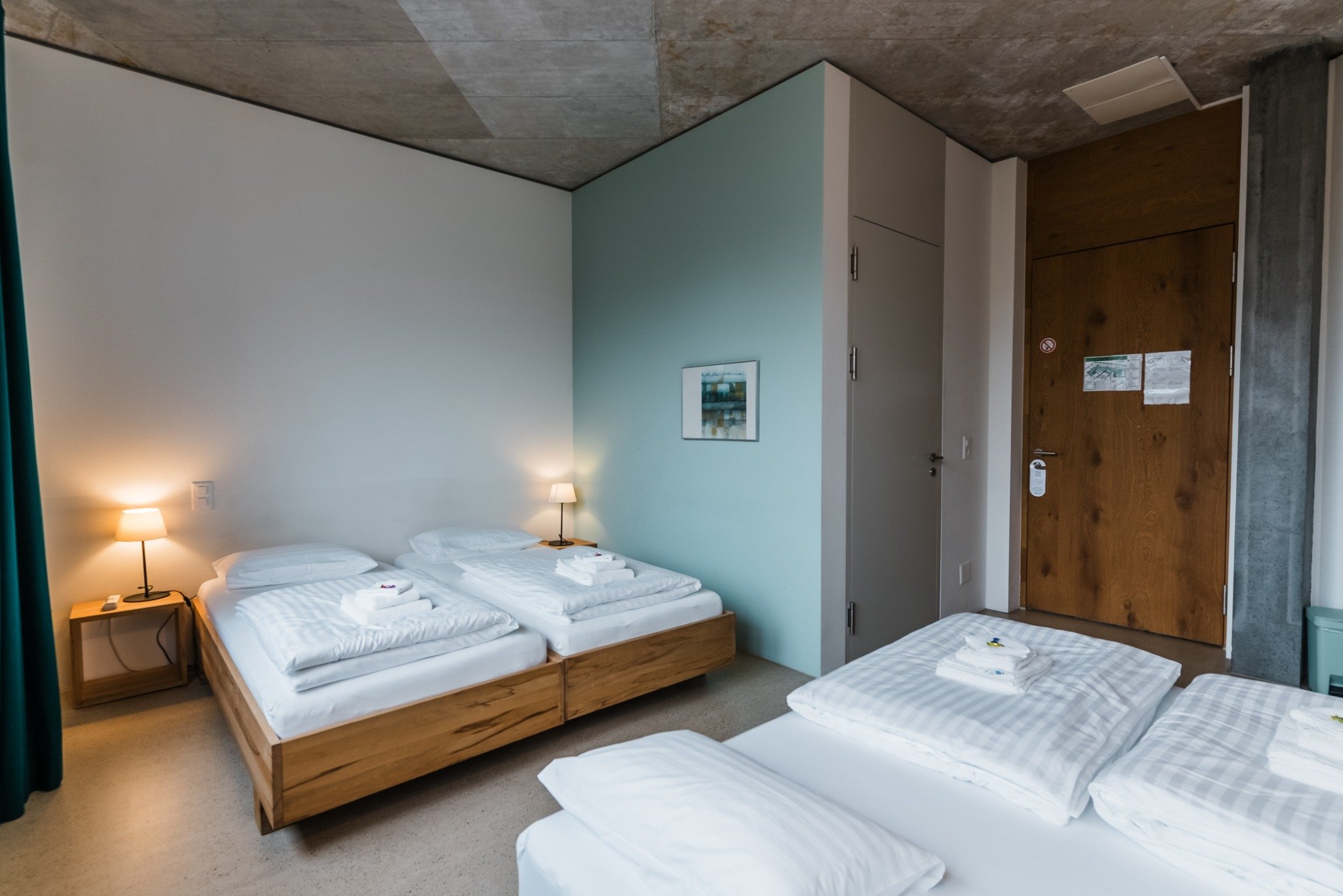 Unterwegs mit Kindern in Zürich? Das Doppelzimmer mit Ausziehsofa bietet Platz für zwei Erwachsene und zwei Kinder. Unser grüner Innenhof mit Spielplatz ist der perfekte Ort zum Klettern, Rutschen und Spielen.